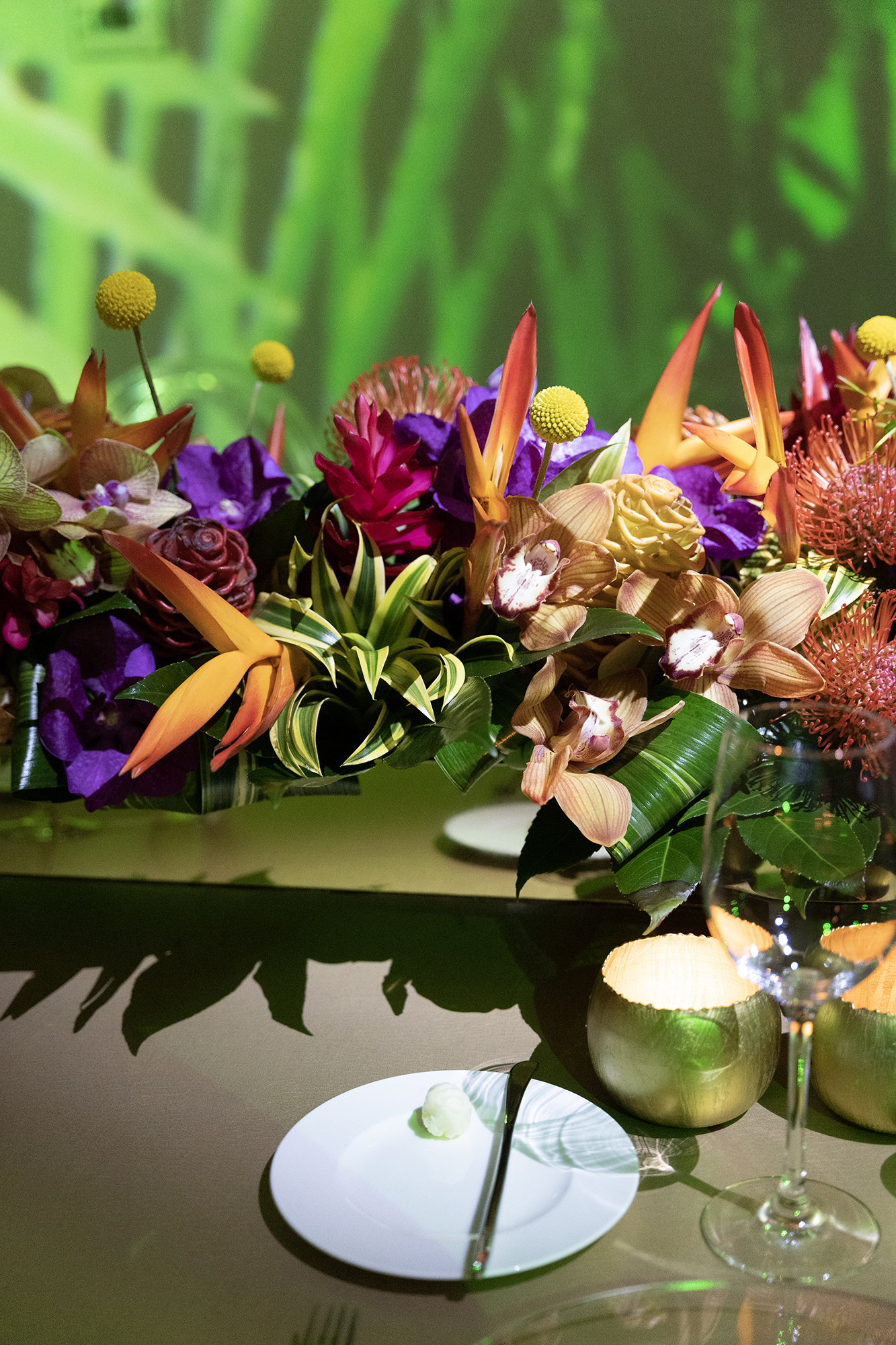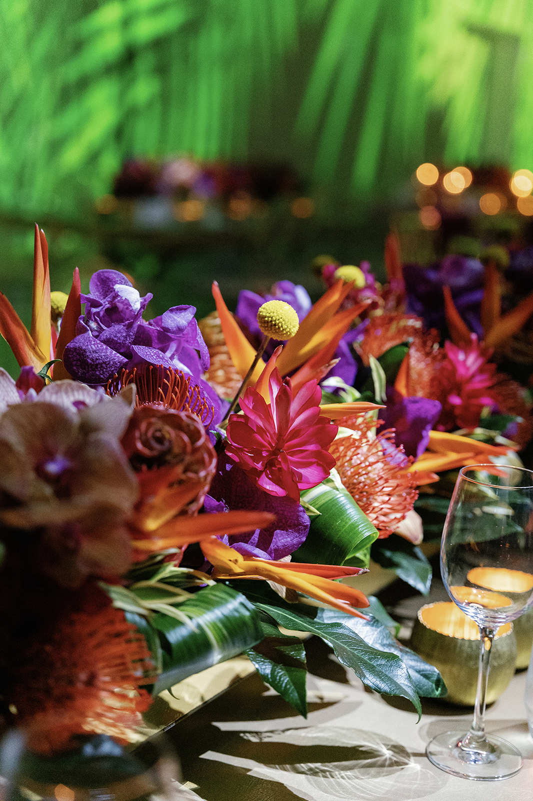 Reception design by Jose Graterol was a masterclass in color and texture. Bright tropical florals — orchids, birds of paradise, pincushion proteas — bloomed across every table. Lighting transformed the space as night fell. Event projection mapping wrapped the Faena Forum walls, moving from Miami’s skyline to swirling abstract florals to lush digital blooms. It was immersive, electric, and unlike anything I’ve seen.
